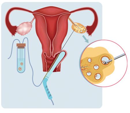 Η λήψη των ωαρίων από την ωοθήκη γίνεται υπό την καθοδήγηση των υπερήχων με την αναρρόφησή τους, μέσω ειδικής βελόνης, από την ωοθήκη, διακολπικά υπό την επήρεια ελαφράς αναισθησίας δίκην μέθης. Η όλη διαδικασία δεν διαρκεί συνήθως περισσότερο από 30 λεπτά. Το υγρό των ωοθυλακίων που αναρροφάται μαζί με τα ωάρια που περιέχει προωθούνται άμεσα στο εργαστήριο για καθαρισμό, αξιολόγηση και τοποθέτηση σε μηχάνημα επώασης, περιμένοντας τη γονιμοποίησή τους από το σπέρμα.